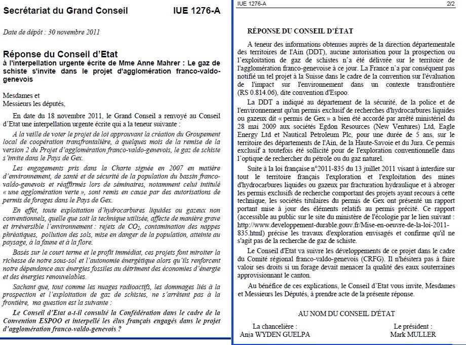 En Suisse on parle de forage sous le lac Léman tandis qu’en France les projets de la société ECorp -détentrice du permis exclusif de recherche d’hydrocarbure dit « de Gex »- ne sont pas stoppés puisqu’ « il ne s’agit pas de gaz de schiste ». La société indique au Ministère français en charge de l’industrie et des Mines qu’elle n’aura pas recours à la fracturation hydraulique. Cette technique (dont aucune définition juridique n’existe) est proscrite depuis Juillet 2011 sur l’ensemble du territoire national. Toutefois, son rapport (3) remis dans le cadre de l’application de la loi indique clairement ses projets d’aller forer dans la roche mère à 4000 mètres de profondeur.