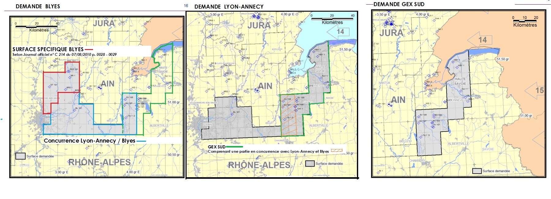 | RÉSUMÉ:– La compagnie Schuepbach a déposé cette demande jugée recevable par les services de l’État. – Cette demande a déclenché une mise en concurrence laquelle s’est traduite par deux autres demandes portant sur ces périmètres plus ou moins semblables. La demande du permis de BLYES et la demande du permis de Gex Sud. – L’instruction au niveau local est terminée. Attente de décision par le Ministère en charge de l’Énergie. – Le périmètre de ce permis inclut les départements de l’Ain, de l’Isère, du Rhône et des deux Savoie. |