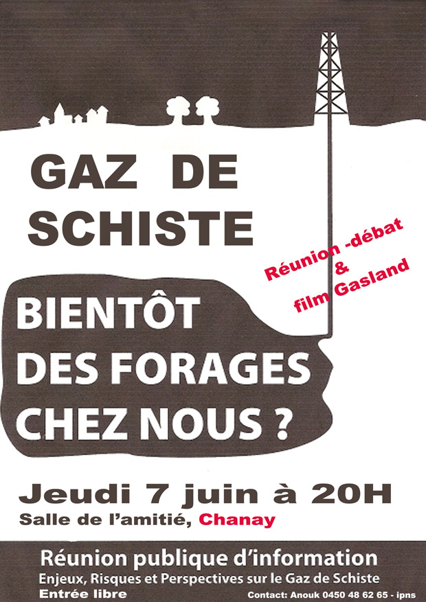 20h00: Réunion publique avec film et débat sur les gaz de schiste à la salle des fêtes.