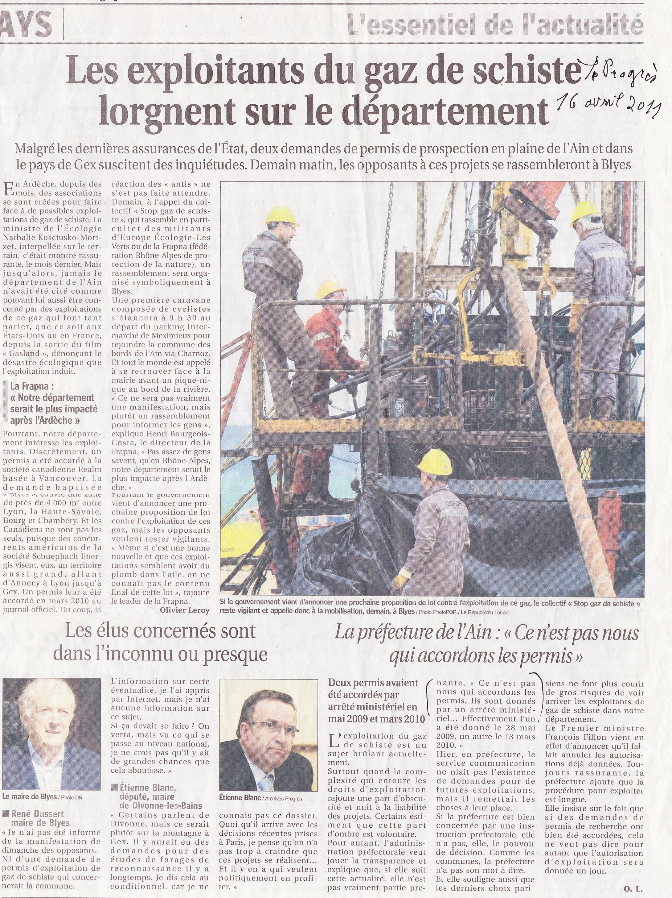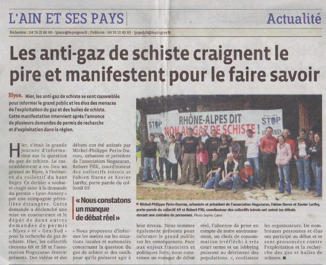Antoine Delsart Le Progrès 18.04.2011: Le prieuré a servi de point de ralliement hier à une centaine de citoyens inquiets. Pas de banderoles, pas de drapeaux non plus. Juste des tracts et des explications donnés par une petite centaine de citoyens inquiets de voir les sociétés exploitant le gaz de schiste sonner à leur porte (lire nos éditions du 16 avril). Ils ont convergé des communes et départements voisins hier, vers le prieuré de Blyes. Une partie d’entre eux, partis en voiture de Meximieux le matin, sont allés à la rencontre des habitants de la Plaine de l’Ain afin de faire connaître les réalités de la fracturation hydraulique.Ce procédé, qui consiste à forer puis injecter de l’eau à haute pression entre 2 000 et 3 000 m, libère, avec le concours de produits chimiques … suite en téléchargement