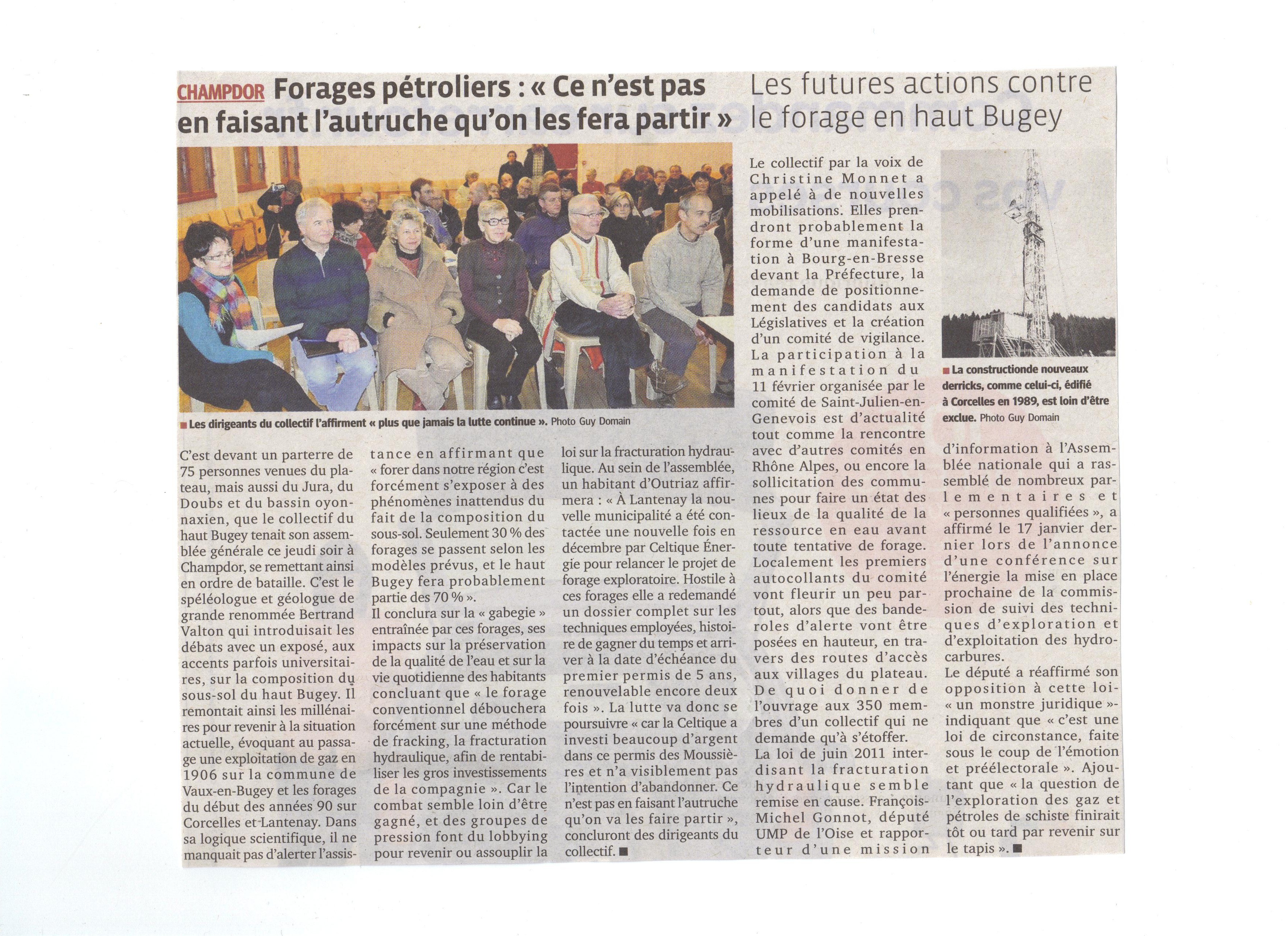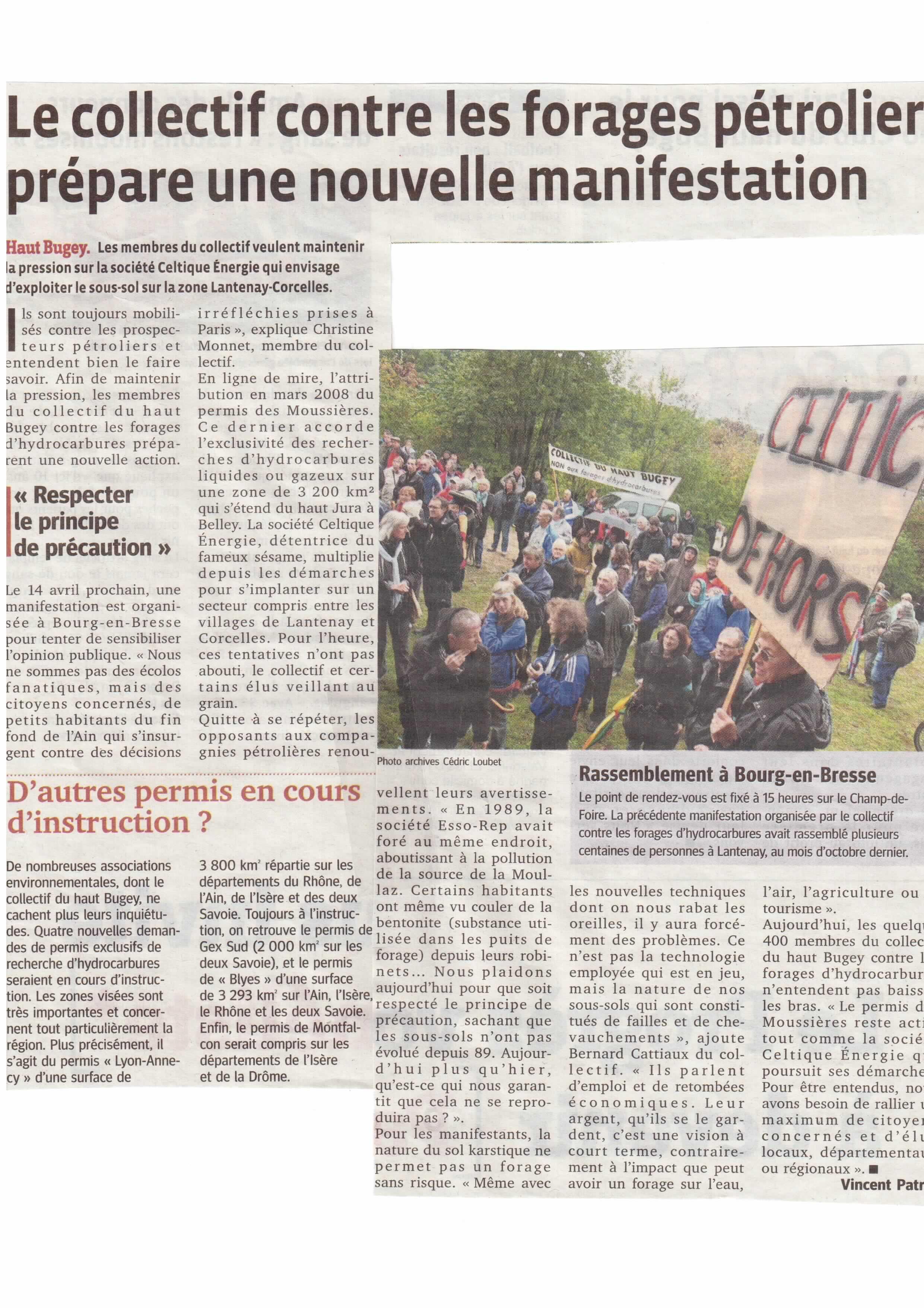 publié le 20.03.2012 Haut-Bugey Les membres du collectif veulent maintenir la pression sur la société Celtique Energie qui envisage d’exploiter le sous-sol sur la zone Lantenay-Corcelles article en téléchargement ici