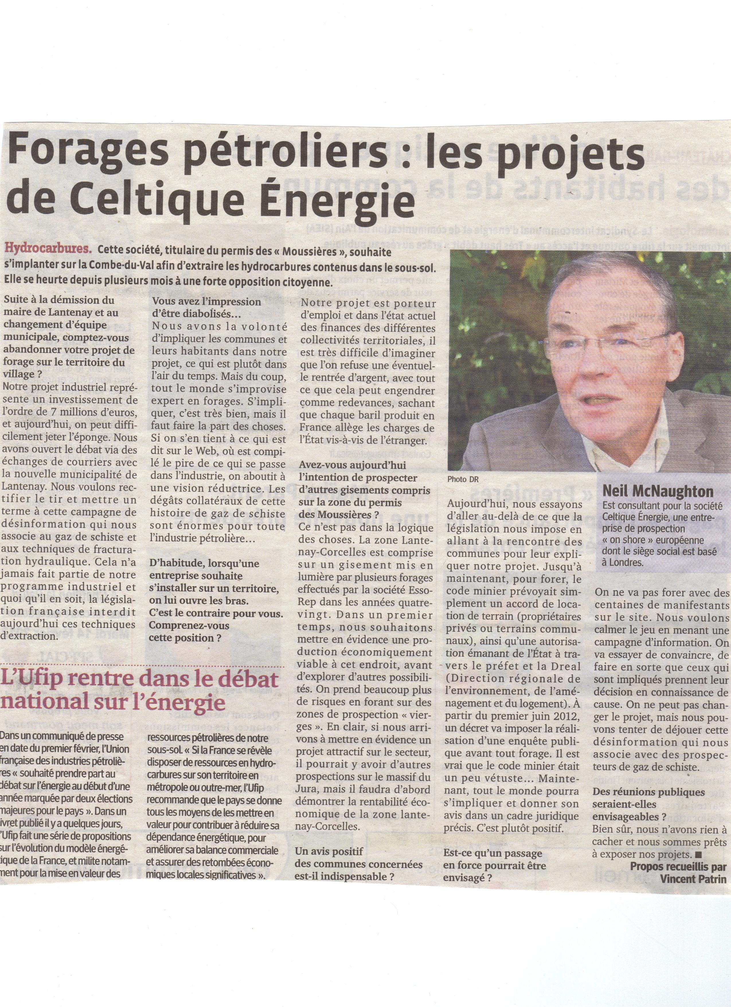 par Corinne Garay le 06/10/2011: Finalement, c’est sur la commune de Lantenay, que la Celtique Energie Petroleum entend focaliser ses recherches pétrolières dans le cadre de son permis d’exploration dit « des Moussières » . En négociation avec la commune pour conduire son projet de forage d’exploration, la société britannique espère conclure un compromis. Centrés sur Corcelles depuis plusieurs mois, les pourparlers sont donc bien engagés sur un terrain qui finalement n’est pas aussi étranger que cela pour les prospecteurs potentiels. C’est en effet sur le site du puits de Chaleyriat à Lantenay prospecté en juin 1989 par Esso Rep avant celui de Corcelles au cours de l’été 1991, que la société souhaiterait installer son derrick de forage. La Celtique Energie Petroleum a présenté son projet lundi 26 septembre au Conseil municipal de Lantenay entre quelques avis d’opposants qui ont brandi dixit la Celtique Energie Petroleum « l’épouvantail du gaz de schiste » et une écoute courtoise… la suite ici