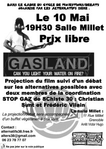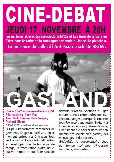 Mon Ciné, 10, avenue Ambroise-Croizat: 20h00 Projection du film Gasland suivi d’un débat animé par des membres des collectifs Stop gaz de schiste 38 et 69