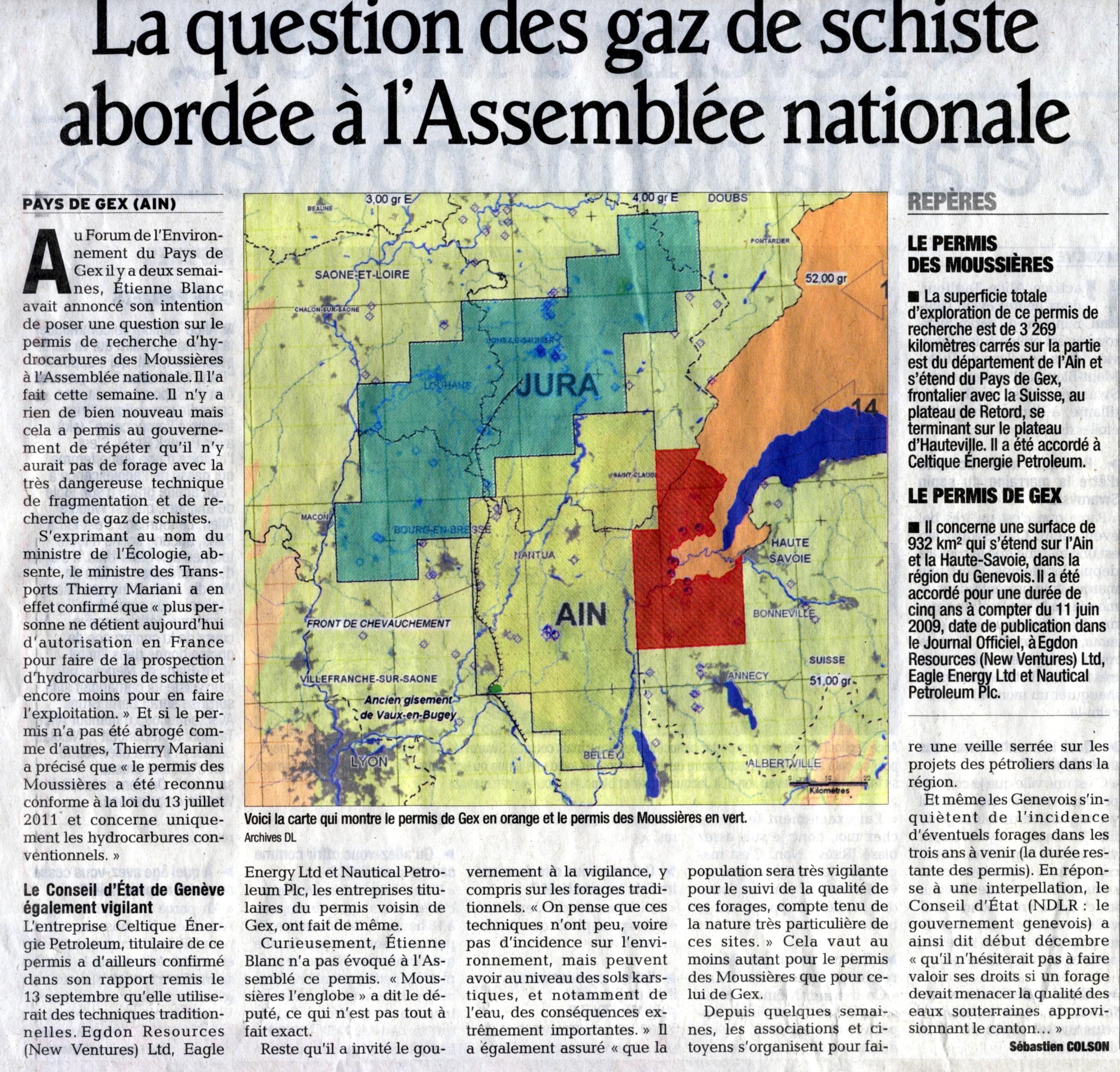 le DL 11.12.2011: La question des gaz de schiste abordée à l’Assemblée nationale. Au Forum de l’Environnement du Pays de Gex il y a deux semaines, Étienne Blanc avait annoncé son intention de poser une question sur le permis de recherche d’hydrocarbures des Moussières à l’Assemblée nationale. Il l’a fait cette semaine. Il n’y a rien de bien nouveau mais cela a permis au gouvernement de répéter qu’il n’y aurait pas de forage avec la très dangereuse technique de fragmentation et de recherche de gaz de schistes. S’exprimant au nom du ministre de l’Écologie, absente, le ministre des Transports Thierry Mariani a en effet confirmé que « plus personne ne détient aujourd’hui d’autorisation en France pour faire de la prospection d’hydrocarbures de schiste et encore moins pour en faire l’exploitation. » Et si le permis n’a pas été abrogé comme d’autres, Thierry Mariani a précisé que « le permis des Moussières a été reconnu conforme à la loi du 13 juillet 2011 et concerne uniquement les hydrocarbures conventionnels. » Le Conseil d’État de Genève également vigilant. L’entreprise Celtique Énergie Petroleum, titulaire de ce permis a d’ailleurs… la suite ici ou l’article complet paru dans le journal ici et là