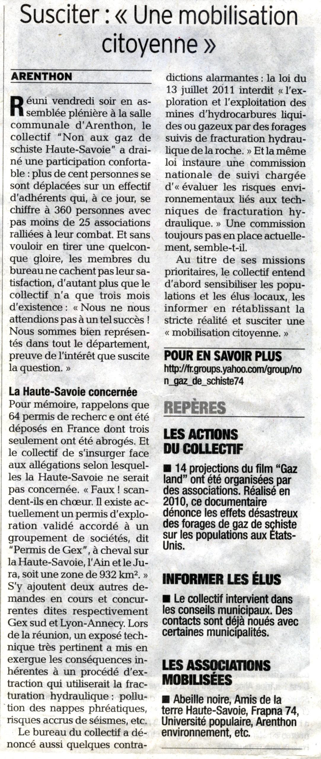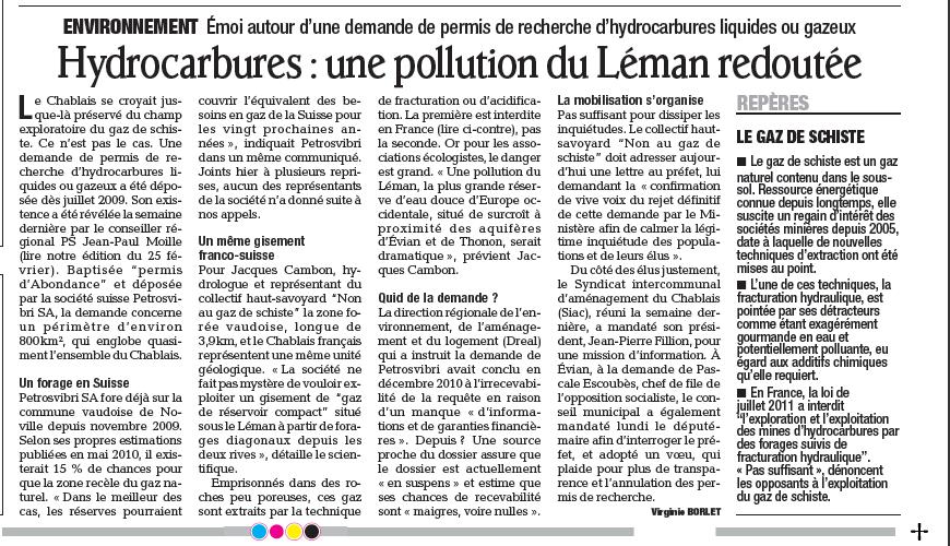 le DL 10.02.2012: Demain à Saint-Julien-en-Genevois, les opposants à l’exploitation du gaz de schiste manifesteront.?Si la loi du 13 juillet 2011 a stoppé net la technique dite de la fracturation hydraulique, elle n’a pas fait taire les craintes en Haute-Savoie et dans l’Ain. Où l’imminence de démarches exploratoires se précise. Contexte. Est-ce un torchon que l’on agite ou une véritable menace ? Du bruit pour rien ou l’alarme qui réveille les consciences ? En gros, faut-il avoir peur du gaz de schiste et des chimères que certains annoncent avec la conviction de prédicateurs illuminés ? Aujourd’hui, il est difficile de se dire au courant de ce que sera l’avenir. En Haute-Savoie même ou dans le Pays de Gex. Là où, dès 2008, les sociétés pétrolières, alors dans les starting-blocks de la nouvelle course aux hydrocarbures de roche-mère, ont posé leur dévolu. Exploration d’un sujet vaporeux. lire a suite ici
