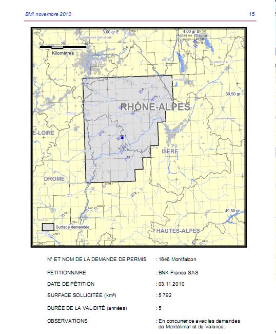 N° : 1592 Zone : 16 Surface : 3800 km2 (trois mille huit cent kilomètres carrés) Nom : Lyon – Annecy Pétitionnaire : Schuepbach Energy LLCNote : En concurrence avec Blyes (voir plus bas)Décryptage de l’Interview de Martin Schuepbach (08/04/2011) à lire absolument sur le site de nos amis ardéchois ici |