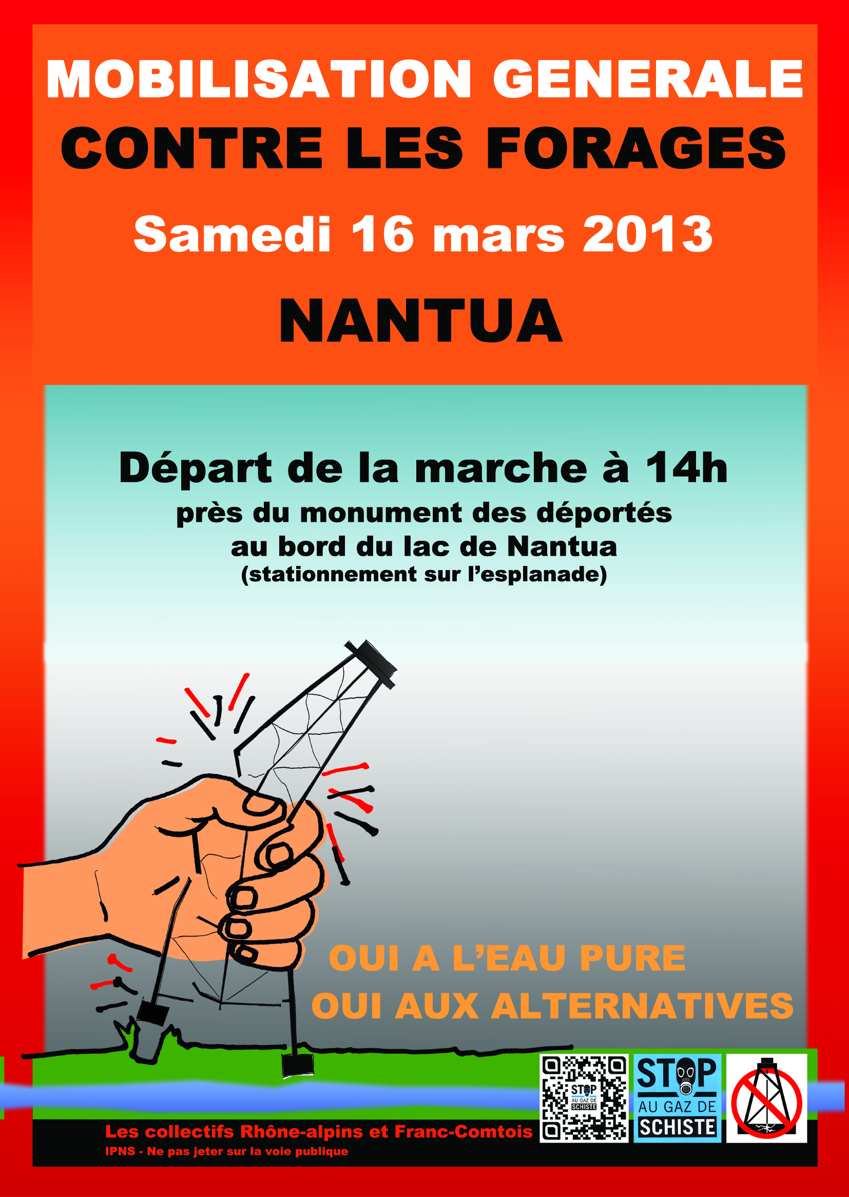 NANTUA 16 MARS 2013Grand rassemblement pour s’opposer au renouvellement du permis des Moussières. Réseau rhônalpin et franc-comtois des collectifs opposés à l’exploitation des gaz et huiles Le soutien des élus au Conseil Général de l’Ain Info à partir des pays de Savoie Info à partir de Bugey Sud Info à partir d’Ardèche