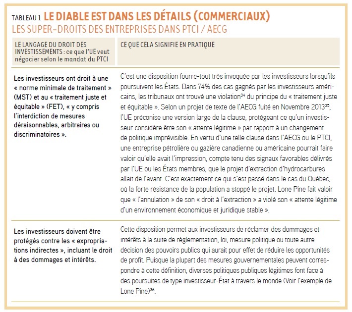 environnementales du développement du gaz de schiste par la fracturation hydraulique, des négociations sont en cours pour un Accord Économique et Commercial Global (AECG) entre le Canada et l’Union Européenne. Controversé, ce dernier permettrait aux investisseurs de contester la décision des gouvernements de réguler ou d’interdire la fracturation.