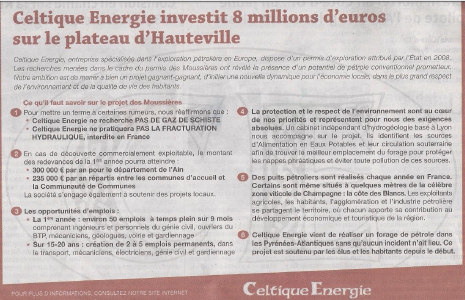 La compagnie Celtique Energy Petroleum s’est vue accorder ce permis par arrêté du 14 mars 2008. Le permis est valable pour 5 ans (renouvelables deux fois).- Le périmètre de ce permis inclut les départements de l’Ain, des deux Savoie et du Jura.- Sur la base des découvertes d’Esso Rep en 1989, Celtique envisage d’effectuer un forage exploratoire et a démarché des communes du plateau de Hauteville dans l’Ain.