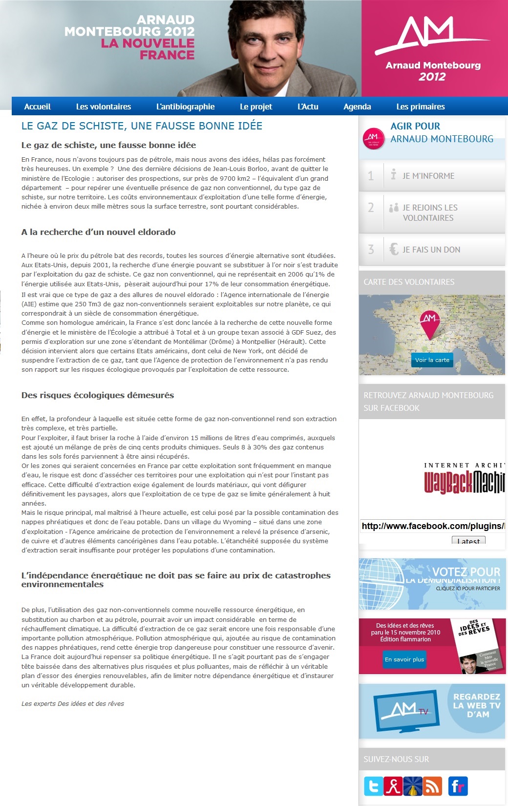 montebourg_A une époque où la primaire du parti socialiste en vue de désigner le candidat à la présidentielle battait son plein, l’un(4) et l’autre(5) se disaient contre l’exploitation du gaz de schiste par la fracturation hydraulique. C’était en 2011. Même Nicolas Sarkozy alors Président avait reculé sur le sujet. Le refus de ces projets d’exploitation des gaz de schiste était quasi général dans la classe politique, les campagnes françaises grondaient qui n’avaient été ni consultées ni informées alors qu’elles découvraient que des permis de recherche avaient été octroyés sans même consulter les habitants ni leur élus. Ségolène Royal indiquait alors être « « favorable à l’interdiction » de l’extraction du gaz de schiste tant que « la maîtrise » de cette exploitation « n’est pas garantie ». Ne fermant pas la porte à une exploitation par « les générations futures », elle jugeait « nécessaire de poursuivre la recherche sur les procédés d’extraction propres à long terme » ».